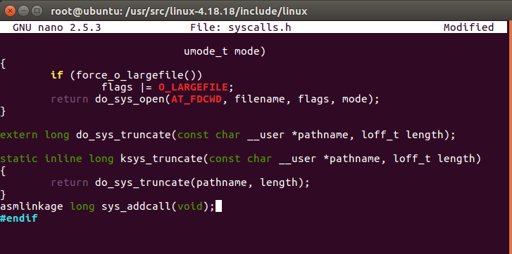 /usr/src/linux-4.18.18에서 진행되기 때문에 밑에 글부터는 해당 위치를 "base_dir"로 명시 "base_dir"/include/linux/syscall.h에 실습에 사용할 함수 정의