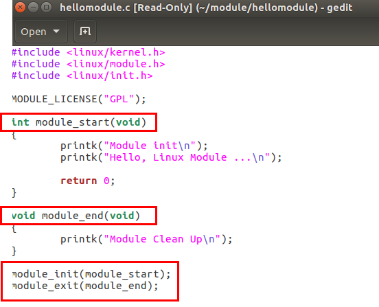 - 생성한 hellomodule 디렉터리 밑에 생성(hellomodule.c)
