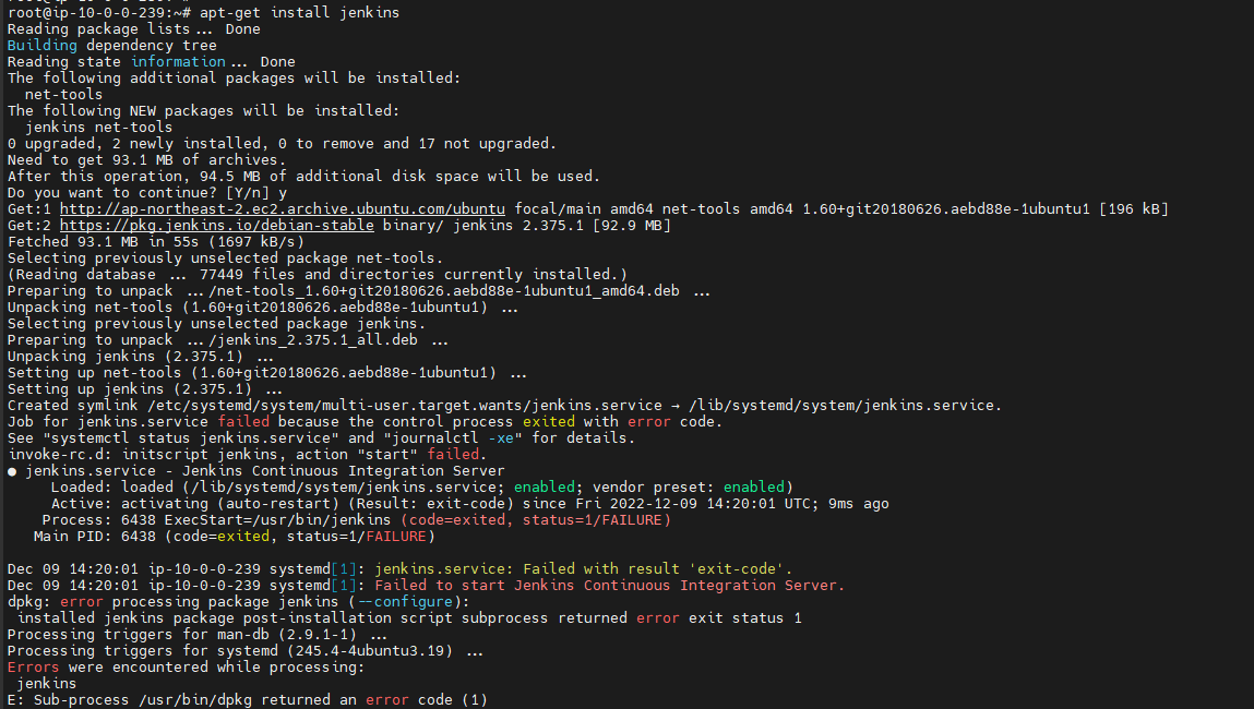 설치에 필요한 모든 설정을 완료하고 apt-get install jenkins 명령어를 입력하면 설치 중에 jenkins를 실행하는데 오류가 발생했다.