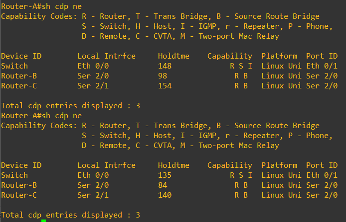 cdp run - Router B에 대한 Holdtime이 계속 줄어들다가 사라짐