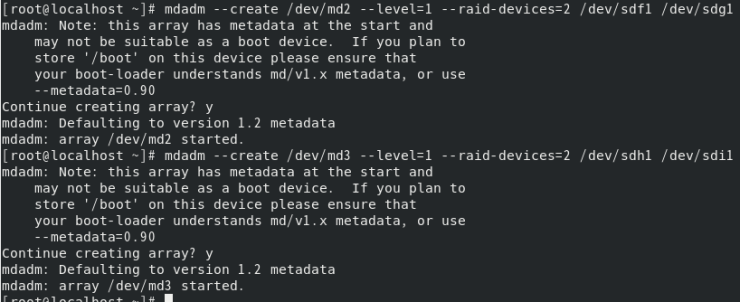 mdadm --create /dev/md2 --level=1 --raid-devices=2 /dev/sdf1 /dev/sdg1mdadm --create /dev/md3 --level=2 --raid-devices=2 /dev/sdh1 /dev/sdi1- 확인 메시지가 나오면 y 입력