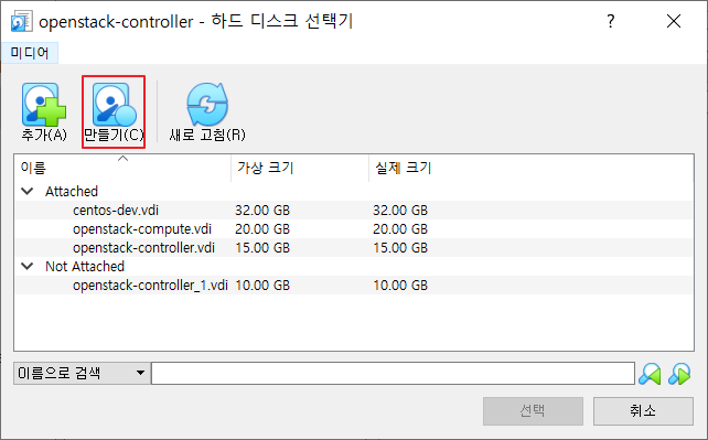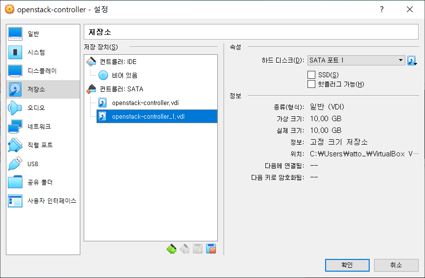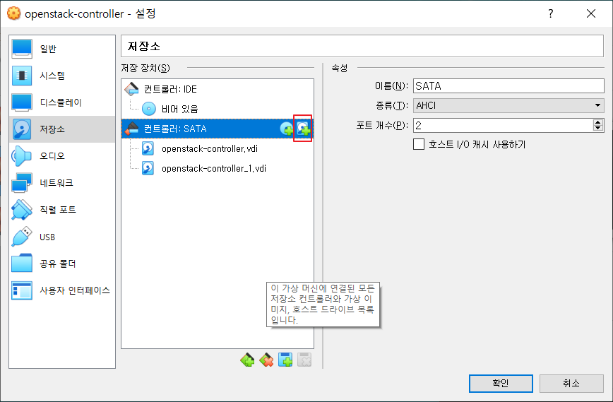 - 컨트롤러 노드에 Storage Node의 기능도 하기 위해 스토리지를 추가한다.