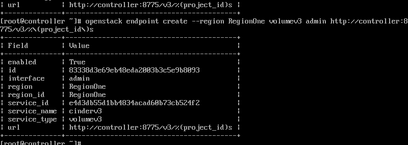root@controller$ openstack endpoint create --region RegionOne volumev3 admin http://controller:8776/v3/%\(project_id\)s
